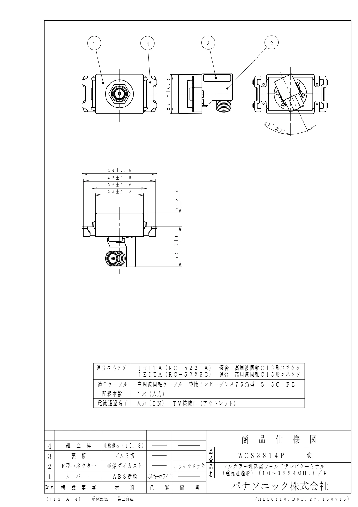 品番:WCS3814P品名:フルカラー埋込高シールドテレビターミナル(電流通過形)(10~3224MHZ)/プラスチック個装