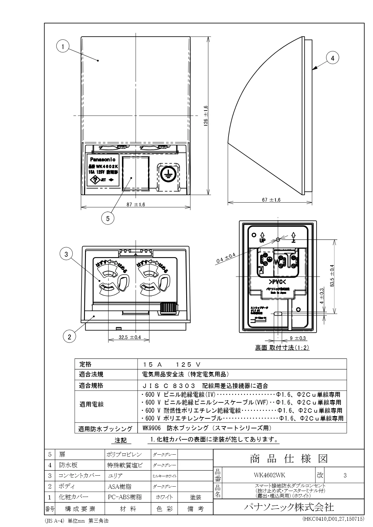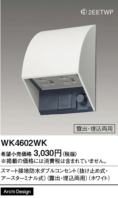 品番:WK4602WK品名:スマート接地防水ダブルコンセント(抜け止め式・アースターミナル式)(露出・埋込両用)(ホワイト)