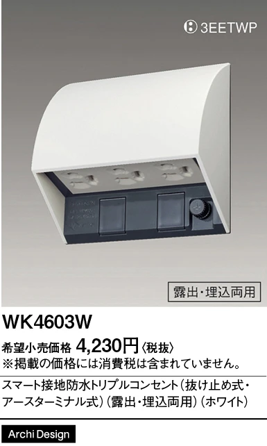 品番:WK4603W品名:スマート接地防水トリプルコンセント(抜け止め式・アースターミナル式)(露出・埋込両用)(ホワイト)
