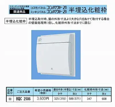 BQC2586 半埋込化粧枠適合外形(半埋込)寸法タテ325(310)xヨコ 586(571)販売価格: ¥4,307メーカー:パナソニック(panasonic)型番: BQC2586 -