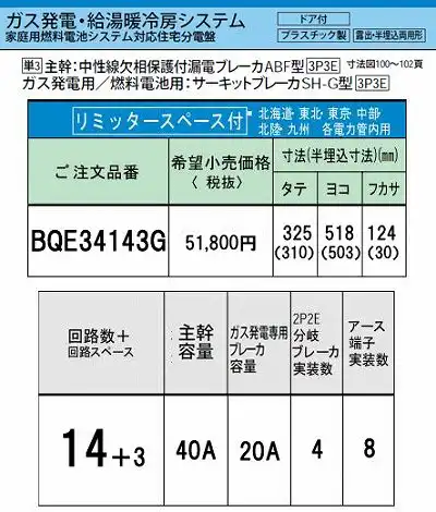 BQE34143G システム|ガス発電・給湯暖冷房システム対応分電盤 単3 リミッタースペースあり 主幹ELB40A 回路数14 + 3販売価格: ¥42,625メーカー:パナソニック(panasonic)型番: BQE34143G -