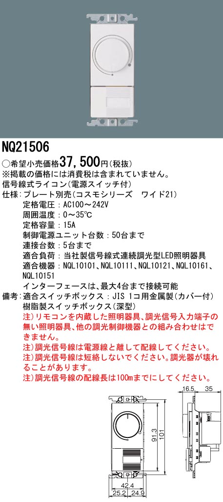 NQ21506 信号線式ライコン(電源スイッチ付) コスモシリーズワイド21販売価格: ¥32,175メーカー:パナソニック型番: NQ21506 -