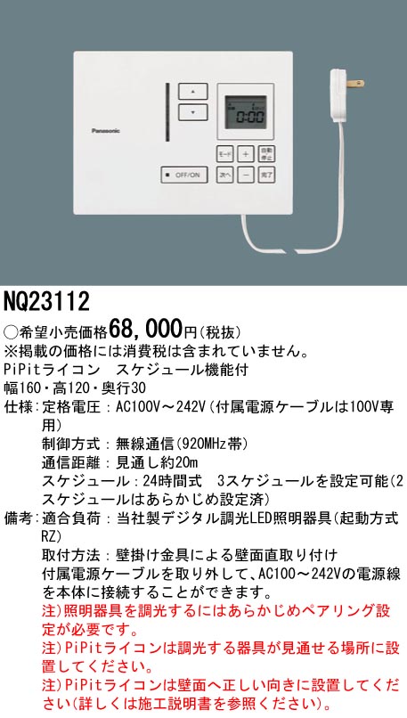 NQ23112 壁直付型 PiPitライコン スケジュール機能付販売価格: ¥67,096メーカー:パナソニック型番: NQ23112