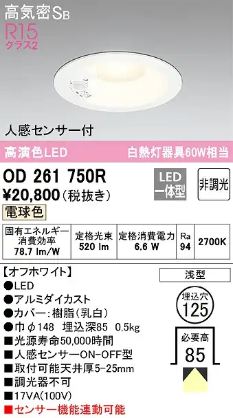 OD261750R センサ付ダウンライト 埋込穴φ125 白熱灯60W相当 非調光・電球色 拡散配光 オフホワイト販売価格: ¥8,694メーカー:オーデリック(ODELIC)型番: OD261750R