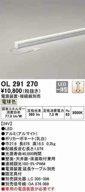 OL291270 間接照明 スリム電源別置(バッテリーなし)タイプ L900タイプ 調光(調光器別売) 電球色3000K販売価格: ¥4,514メーカー:オーデリック(ODELIC)型番: OL291270