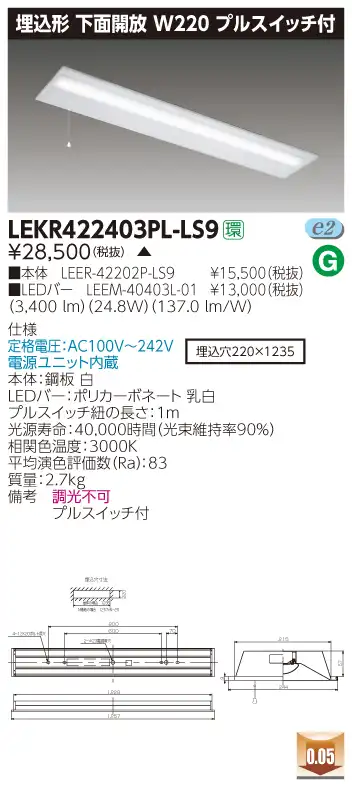 LEKR422403L-LS9 LEDベースライト 埋込40形W220 4000lm 電球色販売価格: ¥10,494メーカー:東芝ライテック(TOSHIBA)型番: LEKR422403L-LS9 -
