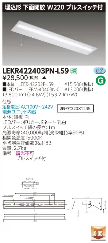 LEKR422523N-LS9 LEDベースライト 埋込40形W220 5200lm 昼白色販売価格: ¥11,649メーカー:東芝ライテック(TOSHIBA)型番: LEKR422523N-LS9 -