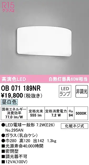OB071189NR ブラケット 壁面取付専用 非調光・昼白色 白熱灯60W相当 密閉型 ガラス(乳白ケシ)販売価格: ¥8,276メーカー:オーデリック(ODELIC)型番: OB071189NR -