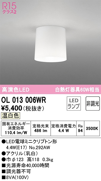 OL013006WR 小型シーリング 白熱灯60W相当 非調光 温白色販売価格: ¥2,257メーカー:オーデリック(ODELIC)型番: OL013006WR -