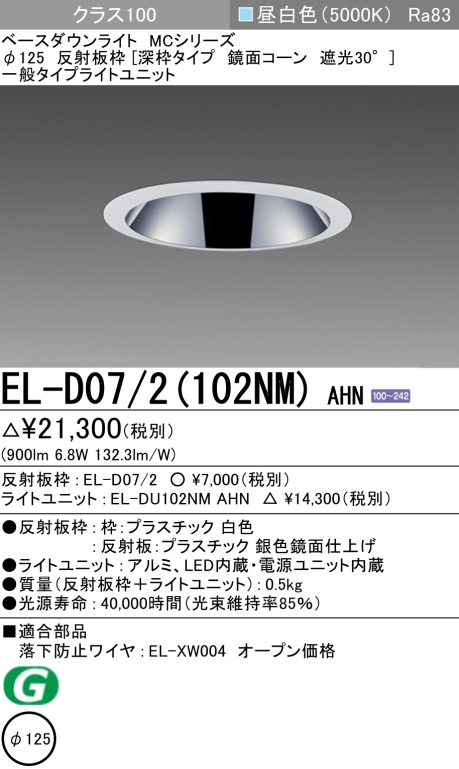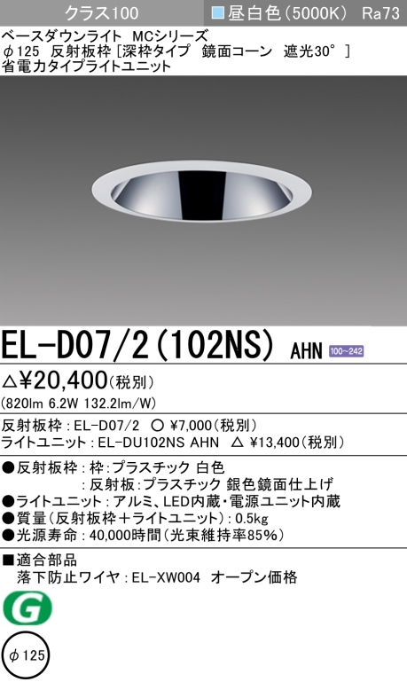 ダウンライト(深枠タイプ) 埋込穴Φ125 クラス100 昼白色 EL-D07/2(102NS) AHN販売価格: ¥5,386メーカー:三菱電機(MITSUBISHI)型番: EL-D072-102NS-AHN -