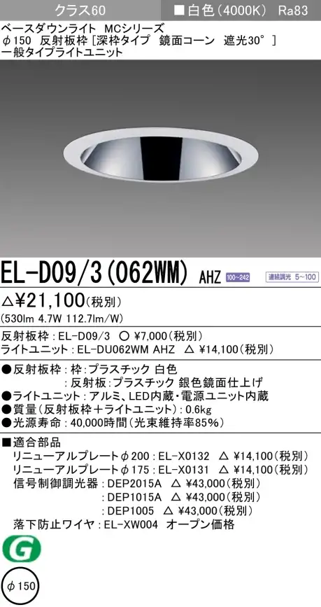 ダウンライト(深枠タイプ) 埋込穴Φ150 クラス60 温白色 EL-D09/3(062WWM) AHZ販売価格: ¥5,570メーカー:三菱電機(MITSUBISHI)型番: EL-D093-062WWM-AHZ -