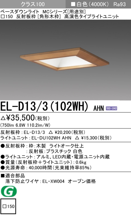 ダウンライト(角形木枠) 埋込穴□150 クラス100 白色 EL-D13/3(102WH) AHN販売価格: ¥9,372メーカー:三菱電機(MITSUBISHI)型番: EL-D133-102WH-AHN