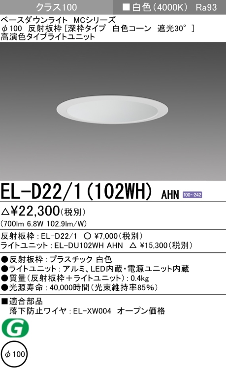ダウンライト(深枠タイプ) 埋込穴Φ100 クラス100 昼白色 EL-D22/1(102NM) AHN販売価格: ¥5,623メーカー:三菱電機(MITSUBISHI)型番: EL-D221-102NM-AHN -