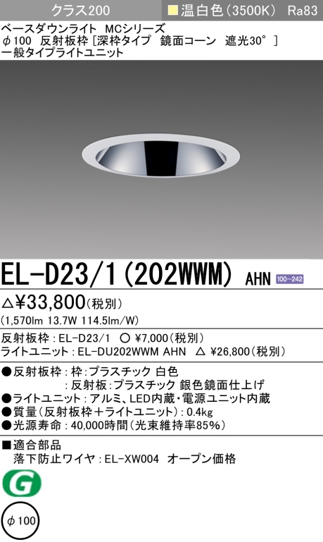 ダウンライト(深枠タイプ) 埋込穴Φ100 クラス200 温白色 EL-D23/1(202WWM) AHN販売価格: ¥8,923メーカー:三菱電機(MITSUBISHI)型番: EL-D231-202WWM-AHN -