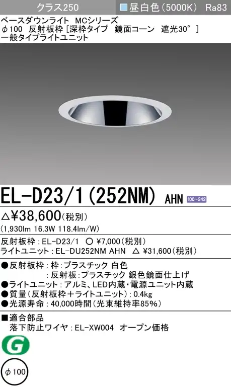 ダウンライト(深枠タイプ) 埋込穴Φ100 クラス250 昼白色 EL-D23/1(252NM) AHN販売価格: ¥10,190メーカー:三菱電機(MITSUBISHI)型番: EL-D231-252NM-AHN -