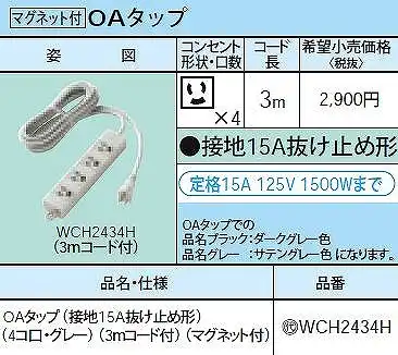 WCH2434H OAタップ(接地15A抜け止め形)(4コ口・グレー)(3mコード付)(マグネット付)販売価格: ¥2,985メーカー:パナソニック(panasonic)型番: WCH2434H -
