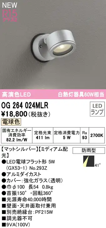 OG264024LR 屋外用スポットライト ランプ交換型 白熱灯60W相当 非調光・電球色 拡散配光 色:マットシルバー販売価格: ¥9,196メーカー:オーデリック(ODELIC)型番: OG264024LR
