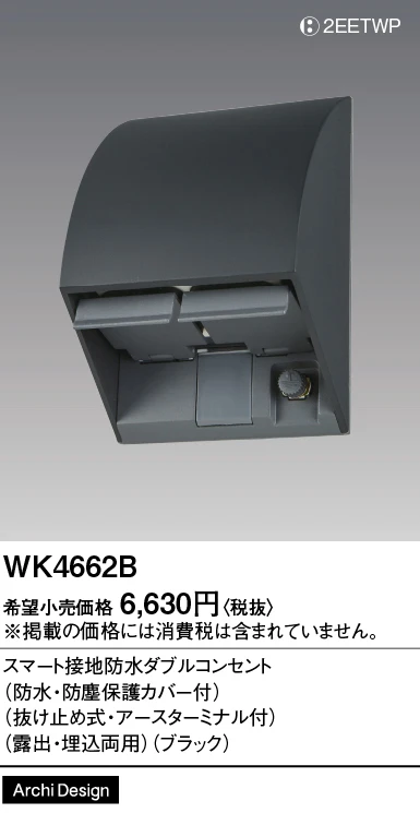 品番:WK4662B品名:スマート接地防水ダブルコンセント(防水・防塵保護カバー付)(抜け止め式・アースターミナル付)(露出・埋込両用)(ブラック)