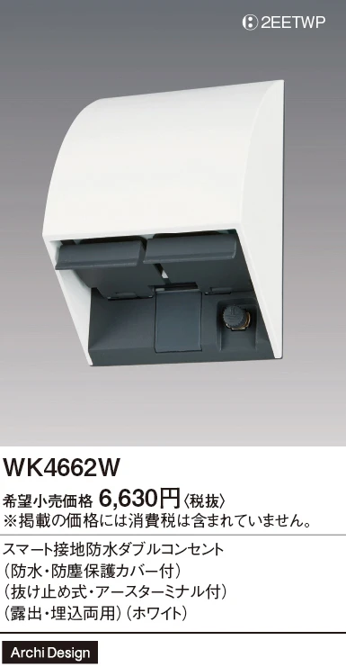 品番:WK4662W品名:スマート接地防水ダブルコンセント(防水・防塵保護カバー付)(抜け止め式・アースターミナル付)(露出・埋込両用)(ホワイト)