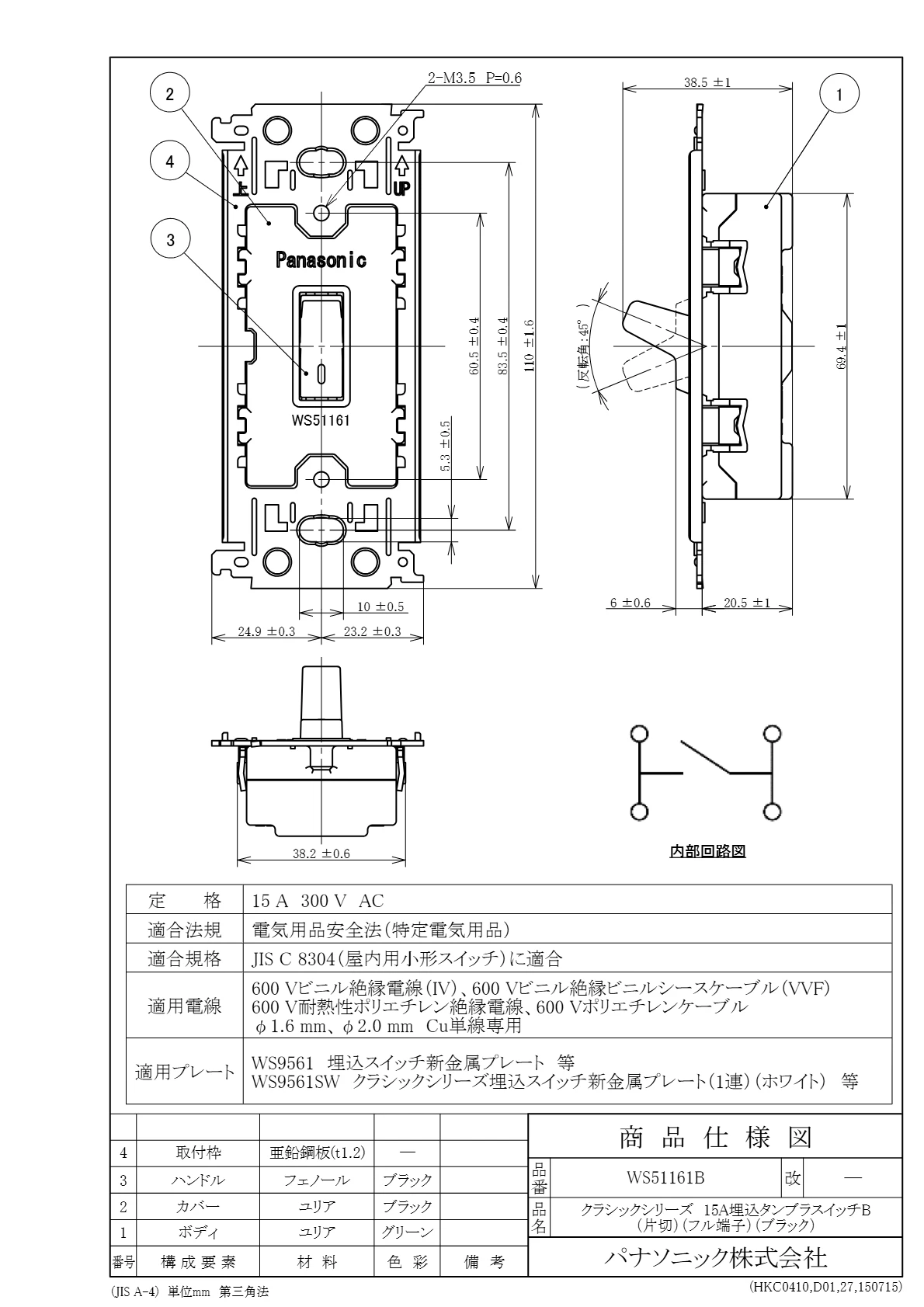 品番:WS51161B品名:クラシックシリーズ15A埋込タンブラスイッチB@(片切)(フル端子)(ブラック)