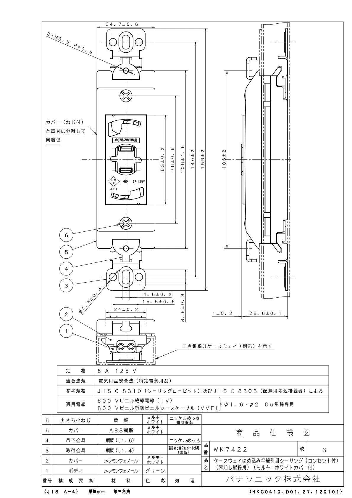 品番:WK7422品名:ケースウェイはめ込み竿縁引掛シーリング(コンセント付)(ミルキーホワイトカバー付)