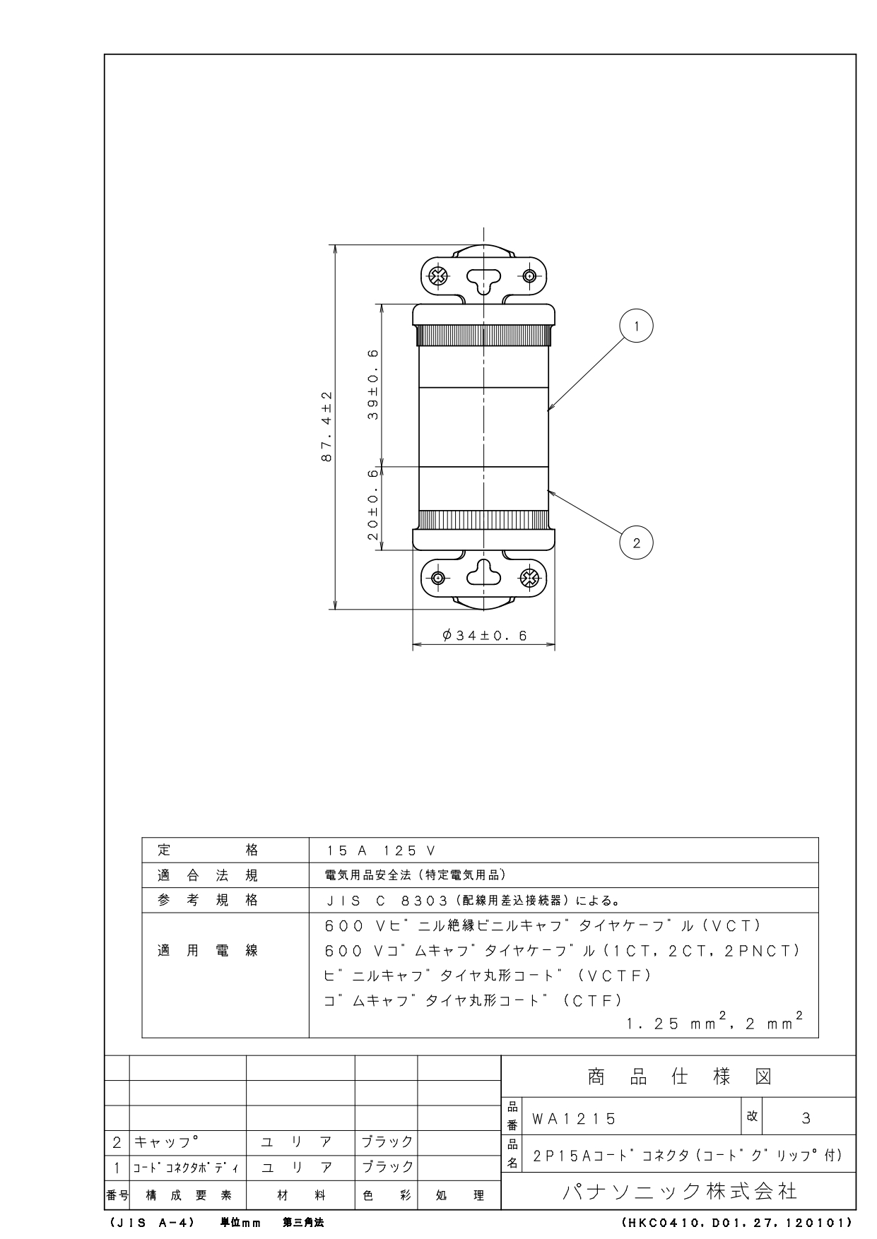 品番:WA1215品名:2P15Aコードコネクタ(コードグリップ付)