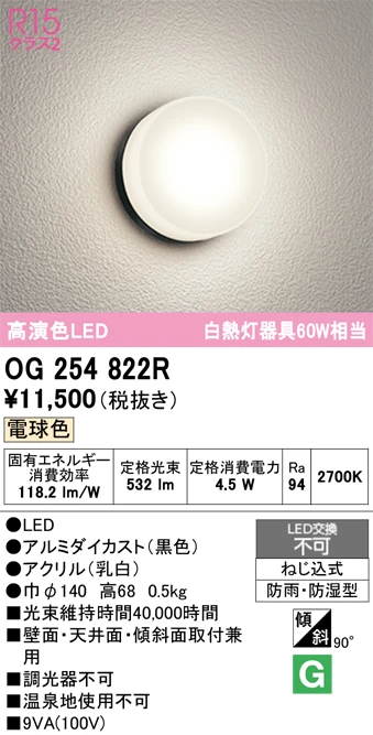 OG254822R ブラケット 壁面・天井面・傾斜面取付兼用 非調光・電球色 白熱灯60W相当 調光器不可 温泉地不可