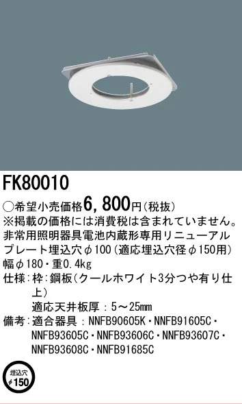 [6枚在庫あり]FK80010 リニューアルプレート 埋込穴φ100(適応埋込穴径φ150) 電池内蔵形非常用照明器具専用型用