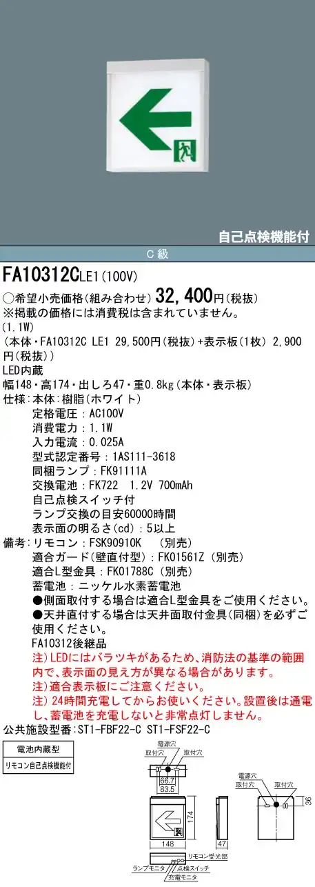 [在庫あり]FA10312CLE1+FK10316 通路誘導灯C級(10形)片面型セット(左矢印パネル付)