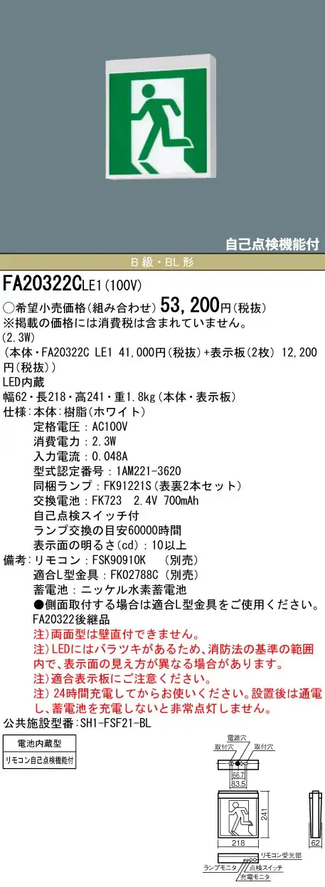 - 誘導灯(非常灯) > 一般型 > 壁・天井直付型・吊下型 > 避難口誘導灯 > パナソニックB級・BL形