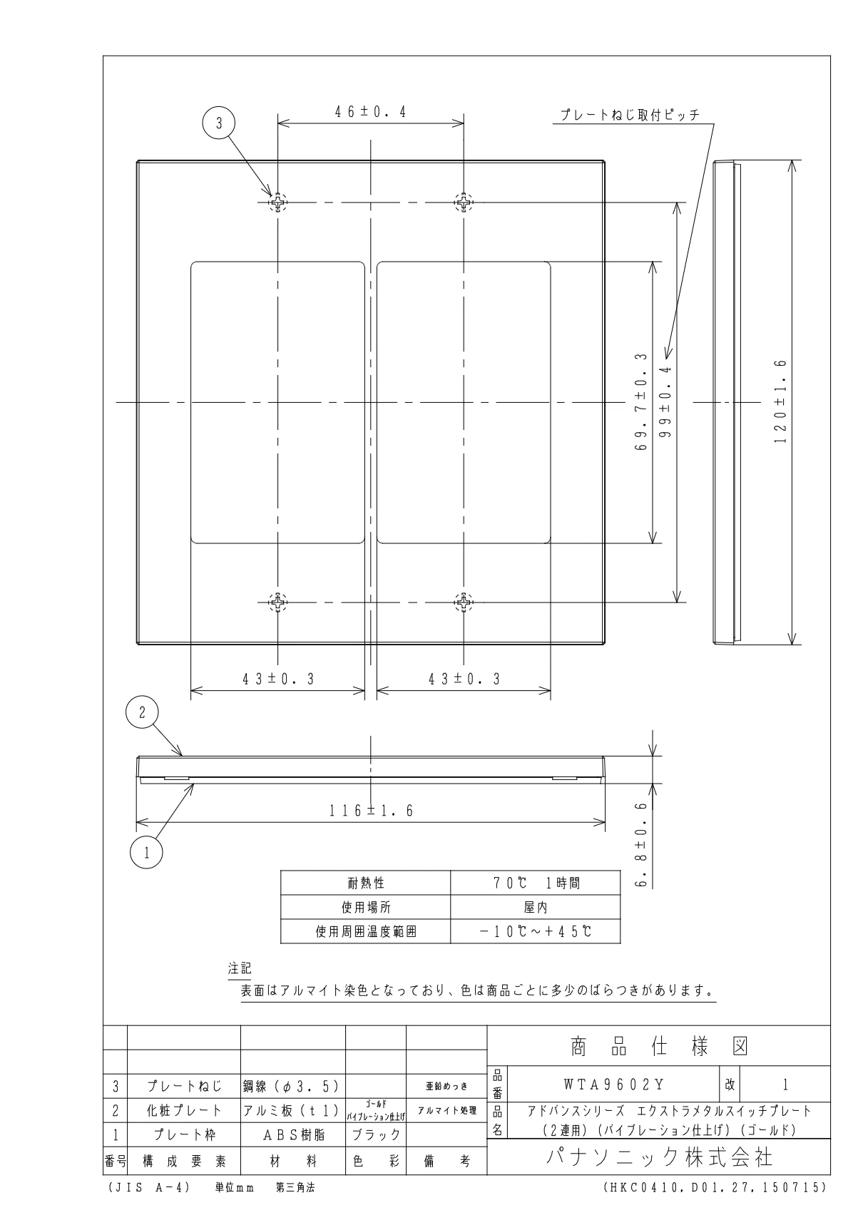 品番:WTA9602Y品名:アドバンスシリーズエクストラメタルスイッチプレート(2連用)(バイブレーション仕上げ)(ゴールド)