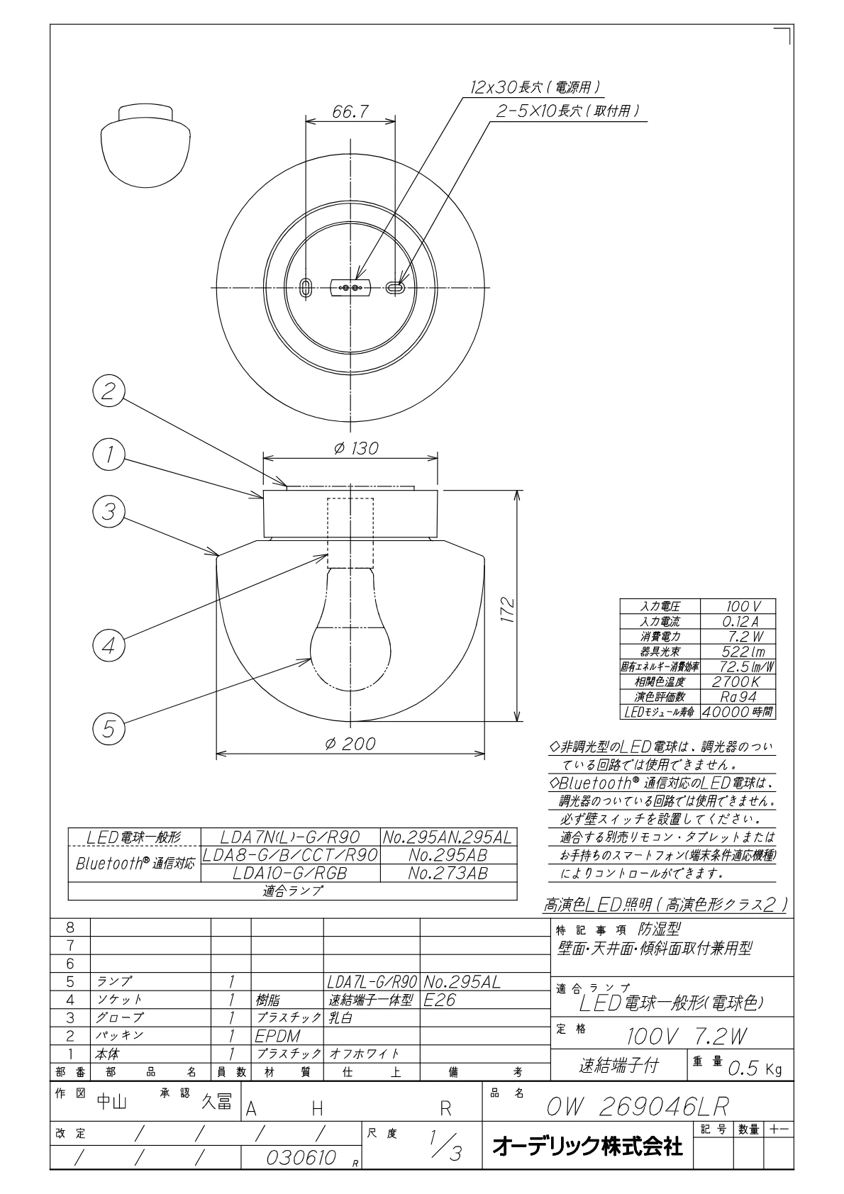 OW269046LR LEDポーチライト 防湿型 非調光・電球色 60W相当 本体色:オフホワイト