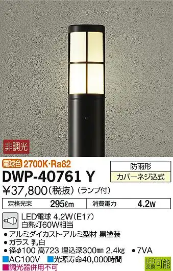 DWP-40761Y ポールライト 地上高700mm 非調光・電球色 LEDランプ付(E17) ランプ交換可 本体色:黒