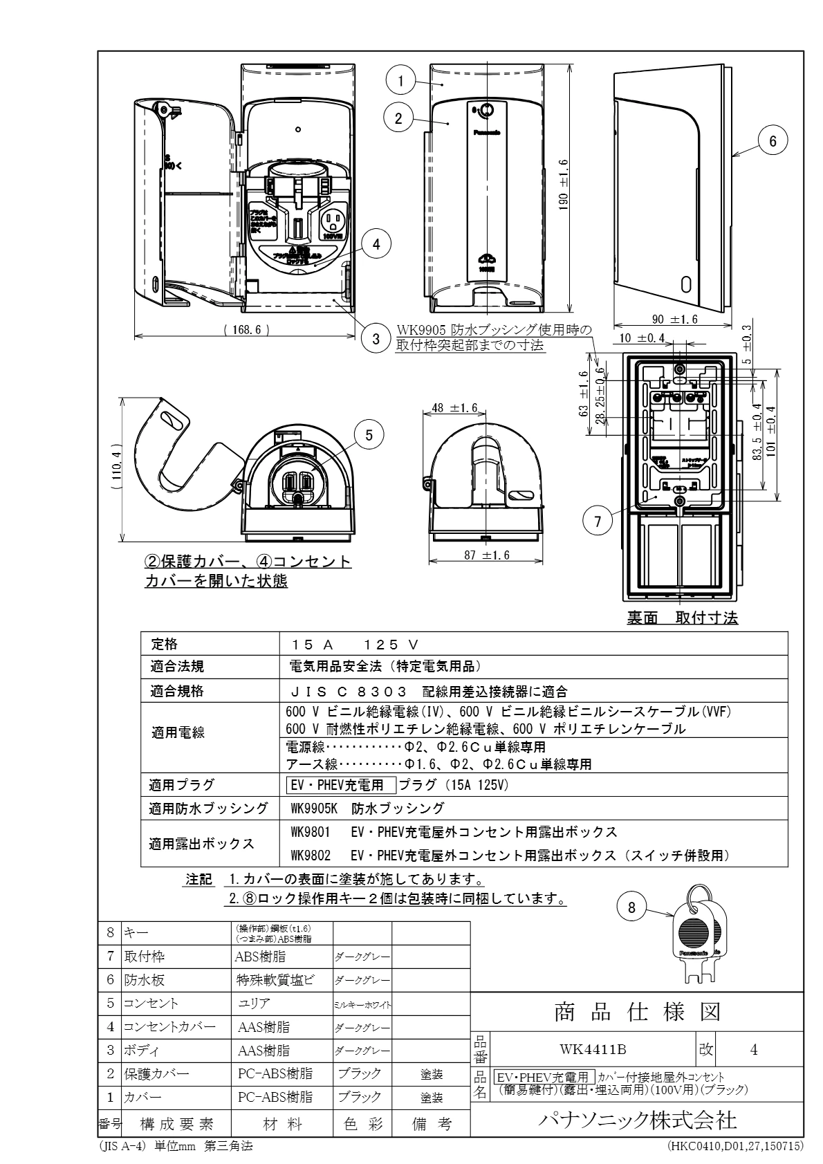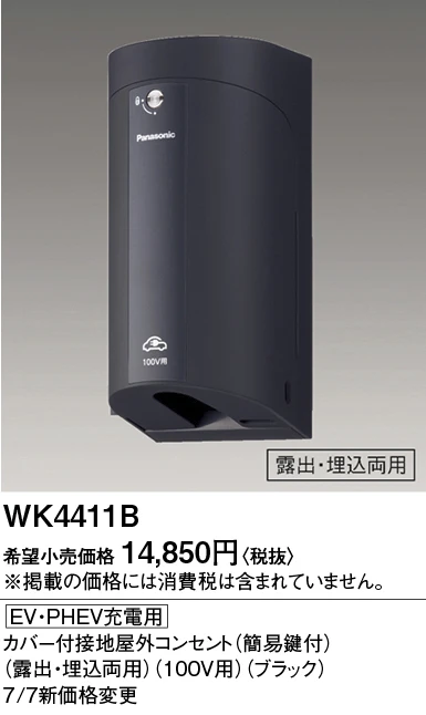 品番:WK4411B品名:EV・PHEV充電用カバー付接地屋外コンセント(簡易鍵付)(露出・埋込両用)(100V用)(ブラック)