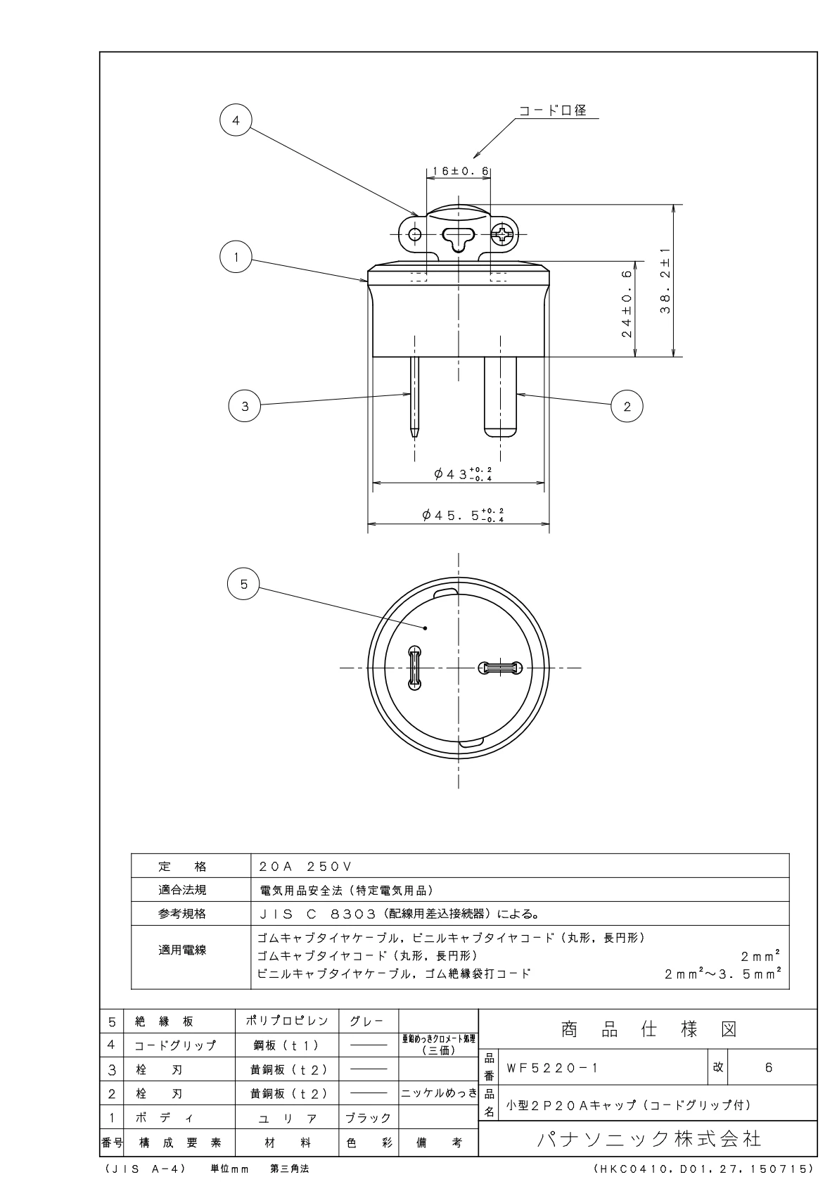 品番:WF52201品名:小型2P20Aキャップ(コードグリップ付)