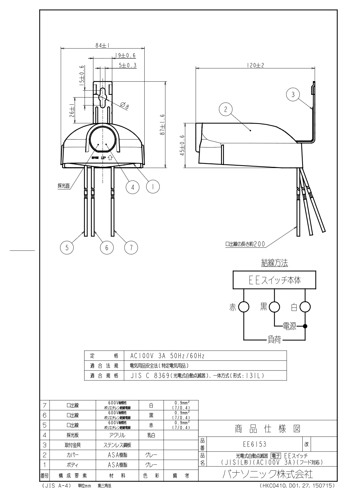 品番:EE6153品名:光電式自動点滅器[電子]EEスイッチ(JIS1L形)(AC100V3A)(フード対応)