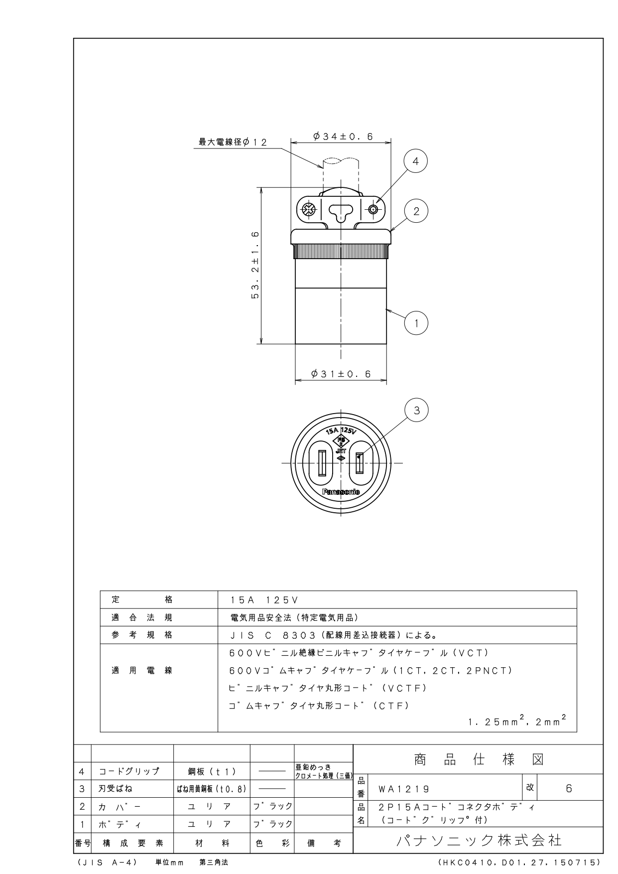 品番:WA1219品名:2P15Aコードコネクタボディ(コードグリップ付)