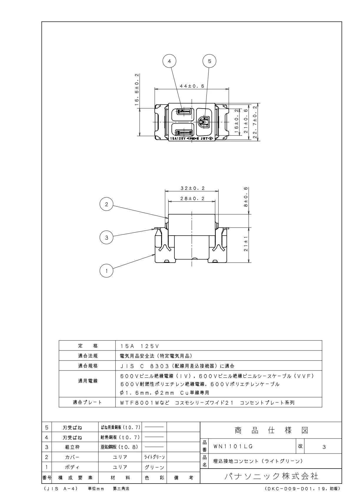 品番:WN1101LG品名:埋込接地コンセント(ライトグリーン)