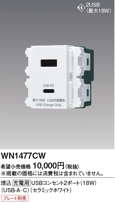 品番:WN1477CW品名:埋込充電用USBコンセント2ポート(18W)(USB-A・C)(セラミックホワイト)