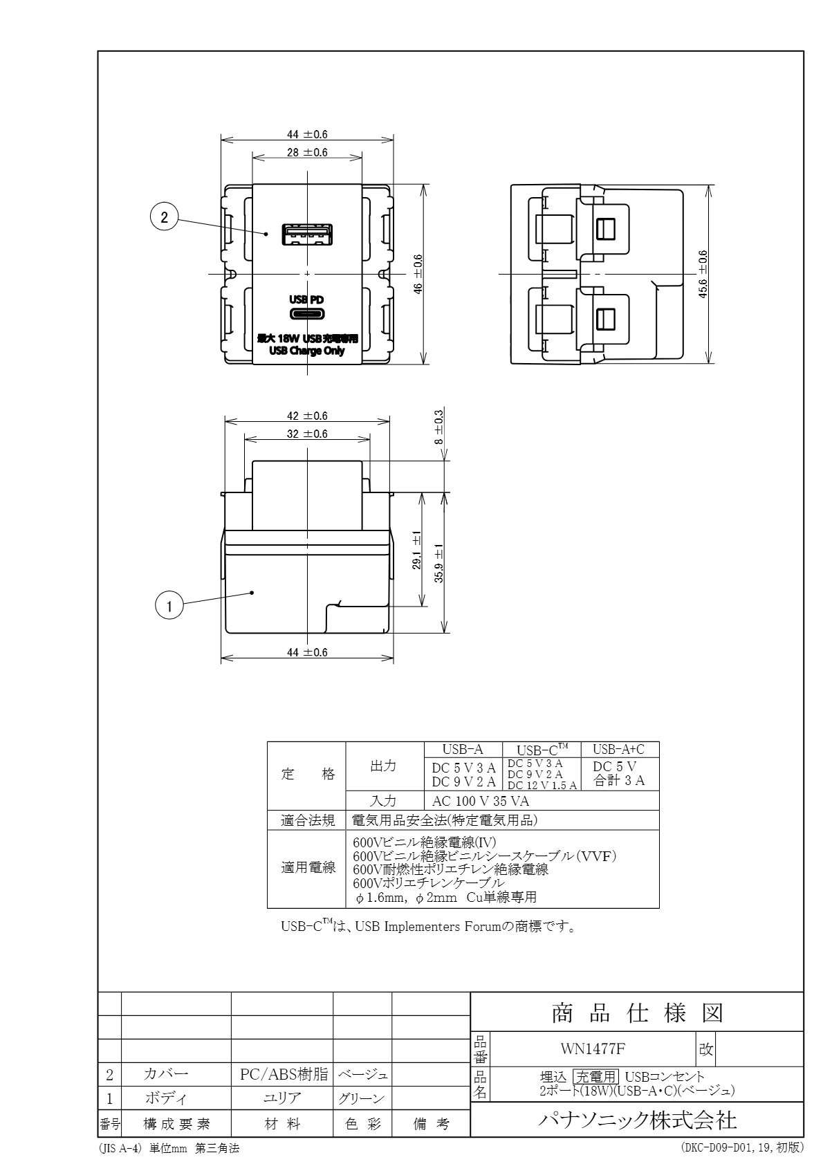 品番:WN1477F品名:埋込充電用USBコンセント2ポート(18W)(USB-A・C)(ベージュ)