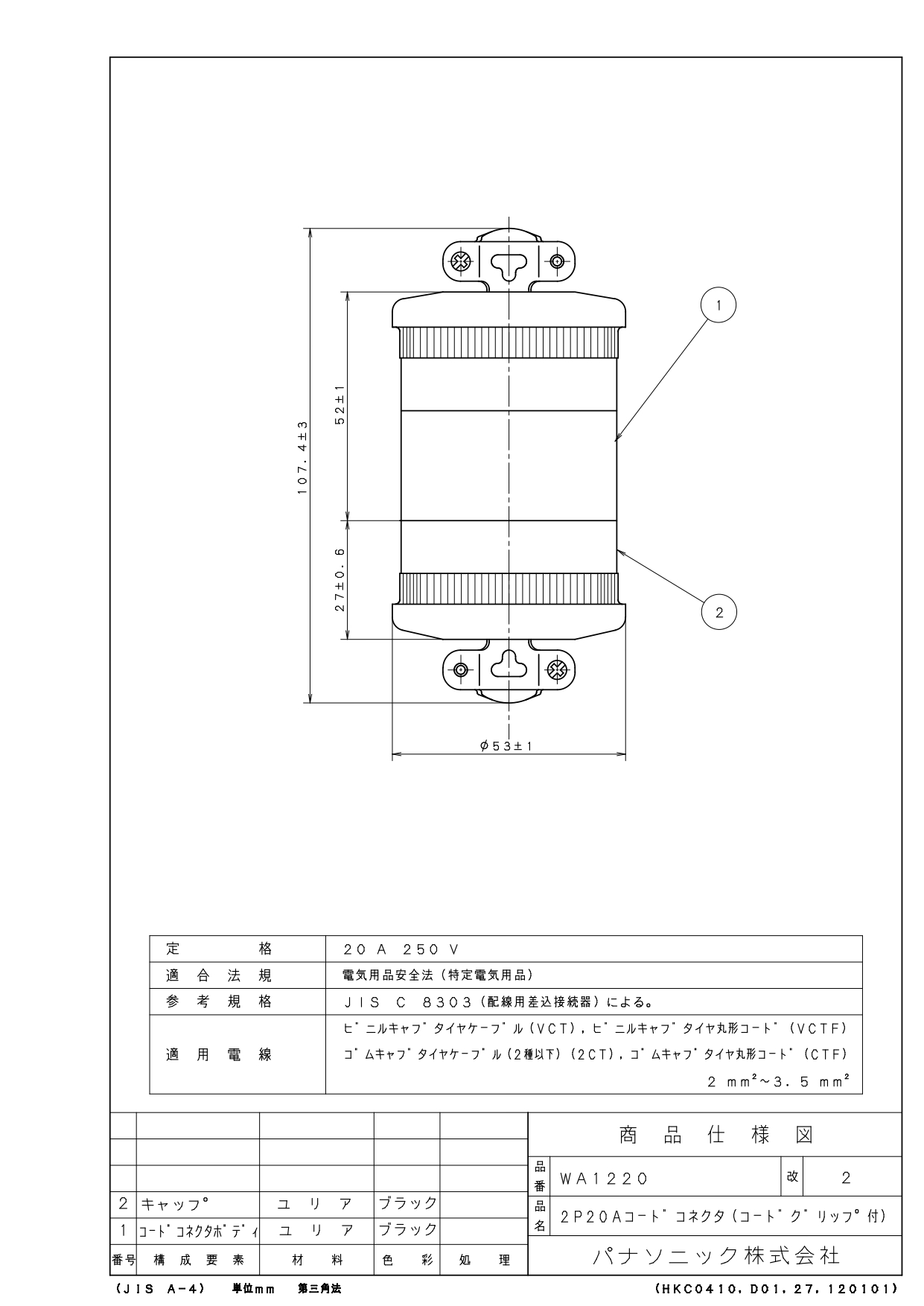 品番:WA1220品名:2P20Aコードコネクタ(コードグリップ付)