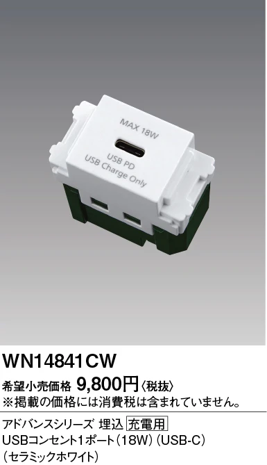 品番:WN14841CW品名:アドバンスシリーズ埋込充電用USBコンセント1ポート(18W)(USB-C)(セラミックホワイト)