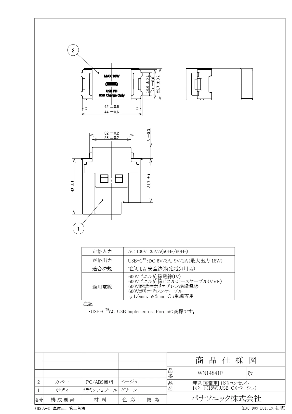 品番:WN14841F品名:埋込充電用USBコンセント1ポート(18W)(USB-C)(ベージュ)