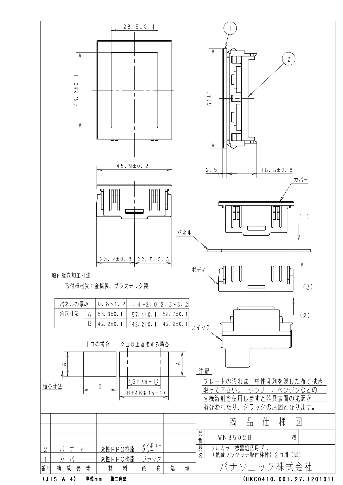 品番:WN3502B品名:フルカラー機器組込用プレート(絶縁ワンタッチ取付枠付)(2コ用)(黒)