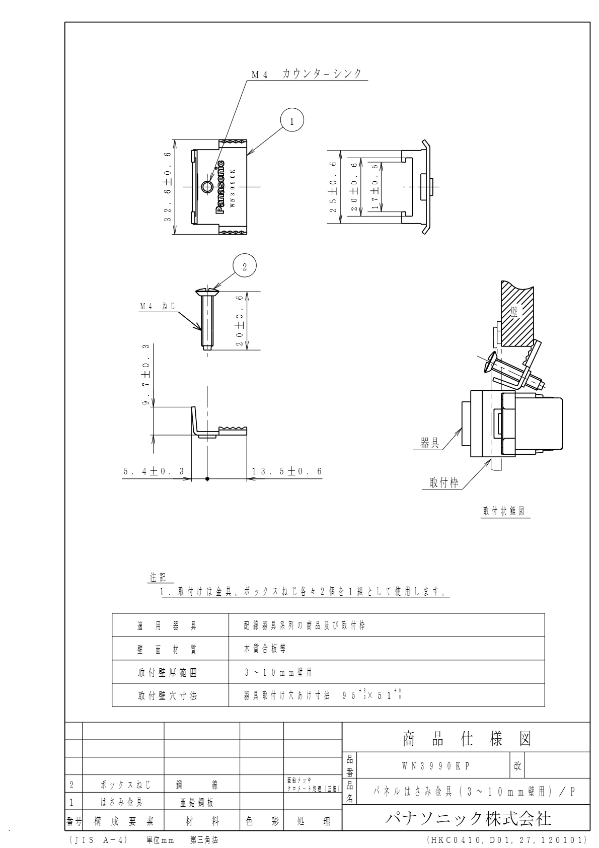 WN3990KP パネルはさみ金具(3~10MM壁用)/プラスチック個装