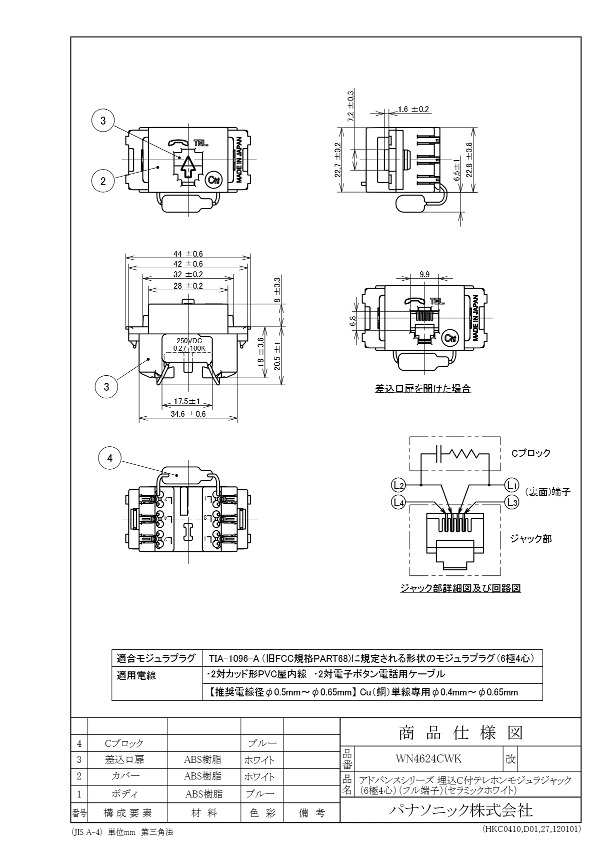 品番:WN4624CWK品名:アドバンスシリーズ 埋込C付テレホンモジュラジャック(6極4心)(フル端子)(セラミックホワイト)