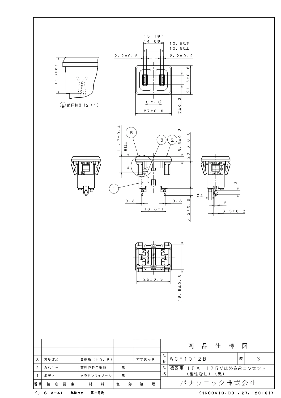 品番:WCF1012B品名:[機器用]15A125Vはめ込みコンセント(極性なし)(黒)