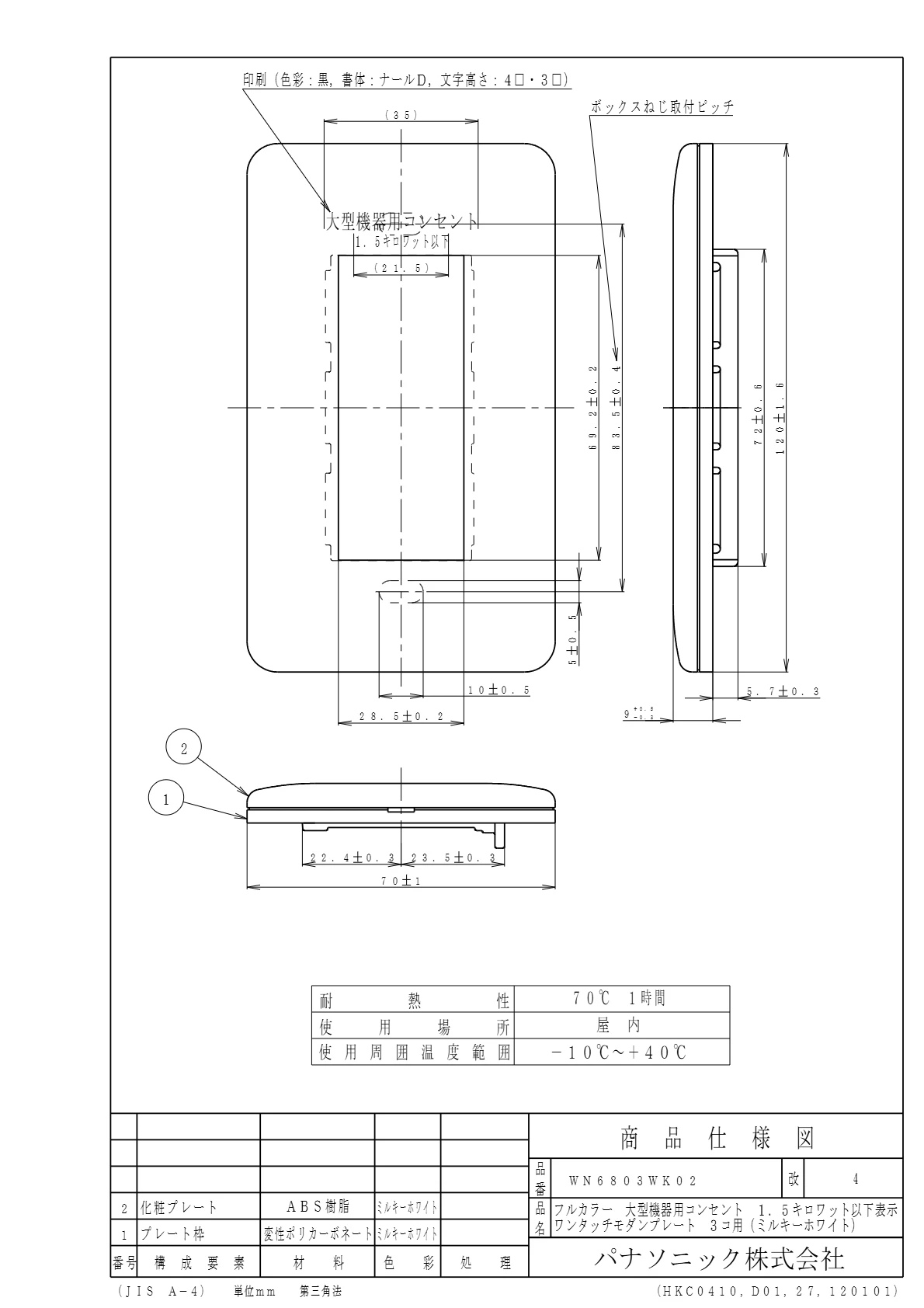 品番:WN6803WK02品名:フルカラー大型機器用コンセント1.5キロワット以下表示ワンタッチモダンプレート3コ用(ミルキーホワイト)