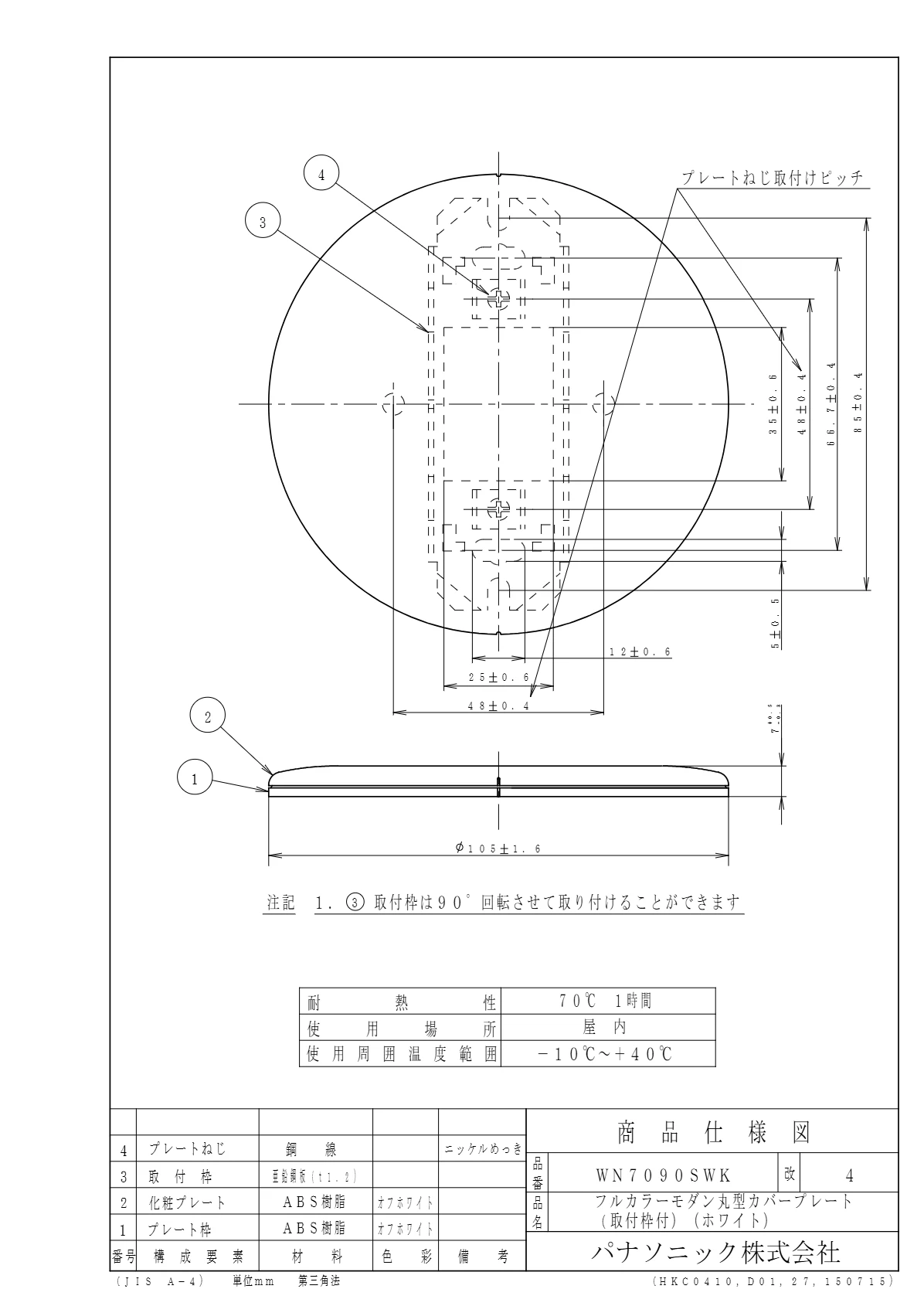 品番:WN7090SWK品名:モダン丸形カバープレート(取付枠付)(ホワイト)