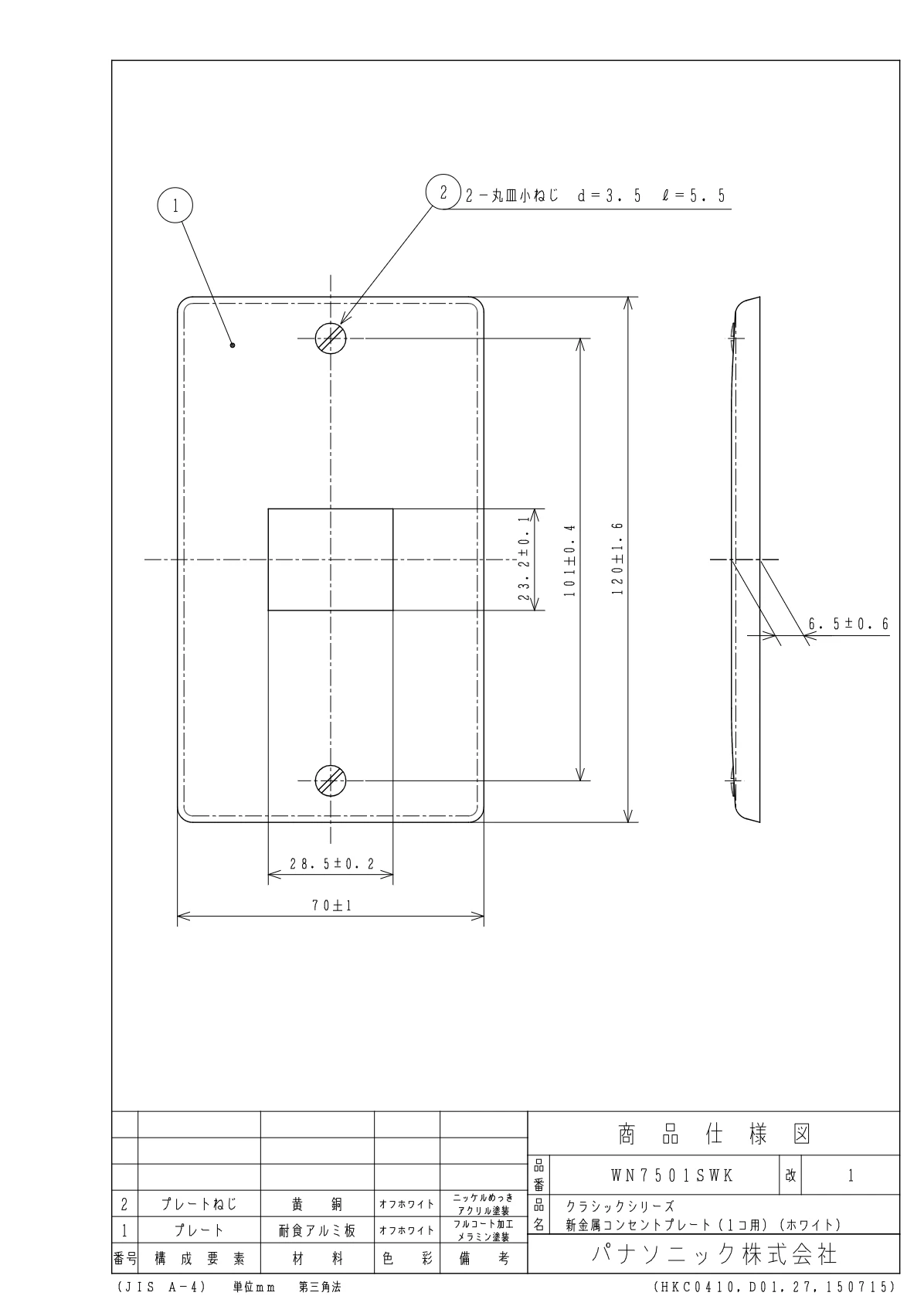品番:WN7501SWK品名:クラシックシリーズ新金属コンセントプレート(1コ用)(ホワイト)